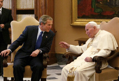 圖:布什會(huì)見羅馬教皇 討論天主教性丑聞事件 2002年05月29日 11:21 美國(guó)總統(tǒng)布什在梵蒂岡與羅馬教皇約翰·保羅二世舉行短暫會(huì)晤。會(huì)晤中談及有關(guān)中東危機(jī)和美國(guó)羅馬天主教性丑聞等問題。法新供中新