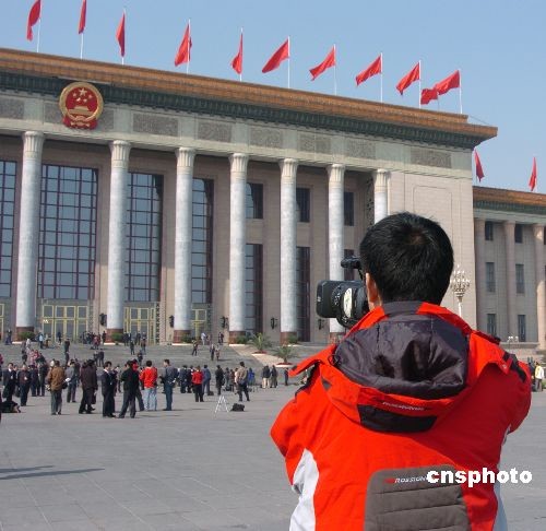2008兩會(huì)召開期間,中外記者們奔波于人民大會(huì)堂、委員和代表們的住處,收集新聞線索,及時(shí)發(fā)回最新的會(huì)議動(dòng)態(tài)和熱點(diǎn)、焦點(diǎn)話題。中新社發(fā) 毛昭勝 攝
