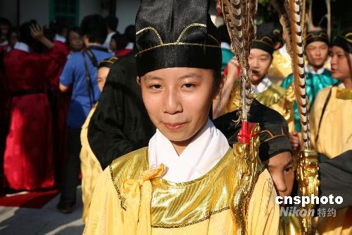 十月五日舉行的臺北祭孔大典上,大龍小學的佾生伴著樂曲起舞,要完成九十六個舞蹈動作,佾生們要練一年以上并寫出動作記錄才能記住,因此被戲稱為大龍小學的“秘笈”。圖為可愛的小佾生。中新社發(fā) 楊旭 攝