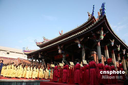 今年是孔子誕辰二千五百五十八周年,原應九月二十八日舉行的臺北祭孔大典,因強臺風“薔薇”來襲而延至十月五日進行。中新社發(fā) 楊旭 攝