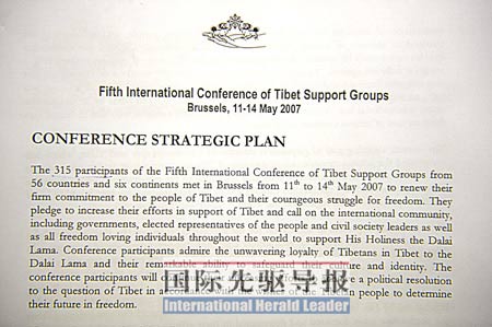 5月14日下午會(huì)議結(jié)束后,本報(bào)記者輾轉(zhuǎn)從一位外國(guó)同行那里得到一份會(huì)議結(jié)果文件。這份長(zhǎng)達(dá)6頁(yè)的文件講述了“西藏流亡政府”及支持西藏國(guó)際組織今后幾年的“戰(zhàn)略計(jì)劃”以及具體的“行動(dòng)計(jì)劃”。