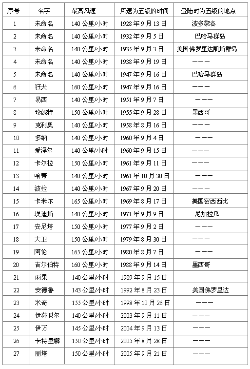 大西洋史上發(fā)生颶風的次數(shù)總共是27次,只有9次登陸時風速仍然保持在五級,其中三次登陸時仍保持五級的颶風都發(fā)生在美國境內,包括1935年在佛羅里達州登陸的“凱斯”颶風、1969年襲擊密西西比的“卡米爾”颶風、1992年襲擊佛羅里達州的“安德魯”颶風。