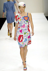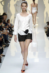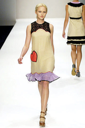 Rebecca Taylor的乖乖女設(shè)計(jì),讓我們看到了充滿學(xué)生味的情竇初開,同樣將愛心做成口袋的還有Eley Kishimoto,將絲綢和蕾絲拼合而成的短裙,那個(gè)醒目的紅色愛心不時(shí)跳躍在模特輕松的步伐上。愛心的另一種表現(xiàn)則被設(shè)計(jì)師們巧妙地運(yùn)用在了腰帶上,Luella和Moschino的愛心都不約而同地被安置在了腰帶上,原來對現(xiàn)代女生而言不用金箭也是可以將愛心牢牢綁住的。