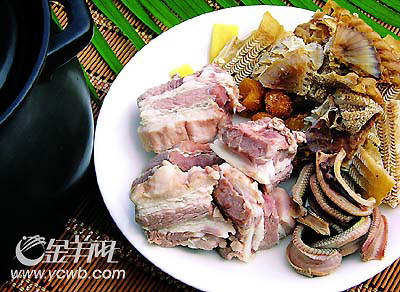 原料:彭魚鰓干、蛇干、脊骨、赤肉、蜜棗、姜片、陳皮、鹽、雞粉。