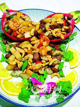 原料:火龍果1個(gè):鮮蝦仁50克、鮮牛柳100克、腰果、四季豆、黃椒、蔥、姜各少量、鮮檸檬片4片