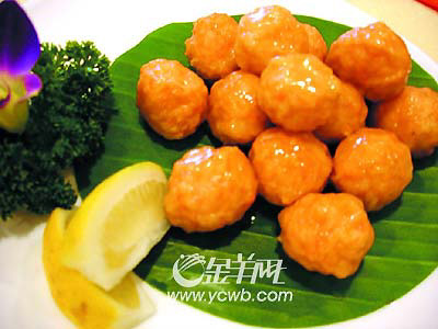 1 將蝦膠(材料:新鮮的海蝦。用鮮蝦仁剁碎,用1/8小勺鹽和少許胡椒粉腌制而成)擠成蝦丸狀,黏上淀粉。起油鍋,最好放橄欖油,待鍋熱了之后,投入蝦球炸至金黃色,撈出,用吸油布吸油,瀝干;