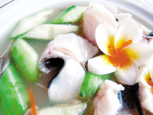 雞蛋花相信廣州人都不會(huì)陌生,我們通常拿它來(lái)煲湯,取其去濕氣、清熱毒、生津止渴的功效。這道“百花過(guò)橋魚”里面就有雞蛋花,此外還有菊花瓣,魚片是浸熟的。這個(gè)名字中的“百花”還有另一個(gè)含義,在廣州餐飲界行話里把花膠也叫做“百花餡”。