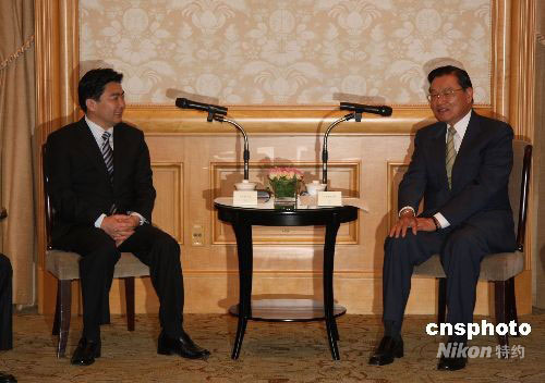 臺(tái)灣;鶗(huì)董事長(zhǎng)江丙坤(右)十月一日在臺(tái)北西華飯店會(huì)見(jiàn)前來(lái)臺(tái)灣參訪的中共江蘇省委常委、蘇州市委書(shū)記王榮。經(jīng)常到蘇州看望臺(tái)商的江丙坤,希望蘇州在中小臺(tái)資企業(yè)融資、勞動(dòng)合同法的實(shí)施及臺(tái)資企業(yè)后續(xù)發(fā)展的土地三個(gè)問(wèn)題上,更多地向臺(tái)商提供輔導(dǎo)和協(xié)助。中新社發(fā) 耿軍 攝