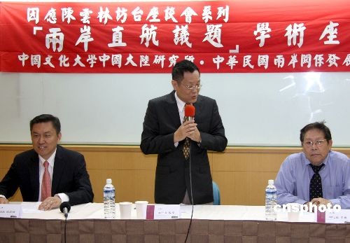 “因應陳云林訪臺座談會系列——兩岸直航議題學術座談會”十七日在臺北舉辦。中國文化大學中國大陸研究所所長邵宗海教授(中立者)邀請“立委”帥化民(右)、前澳門航空公司總經理費鴻鈞(左)做演講。中新社發(fā) 耿軍 攝