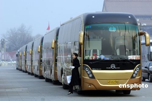 2008年3月8日,停在北京天安門(mén)廣場(chǎng)、全國(guó)政協(xié)十一次會(huì)議會(huì)場(chǎng)外的環(huán)保節(jié)能大巴。據(jù)悉,這種平均百公里油耗不到5升的環(huán)保大巴是首汽首次為“兩會(huì)”代表團(tuán)提供服務(wù)。此外,為營(yíng)造奧運(yùn)年氣氛,“兩會(huì)”服務(wù)車(chē)的內(nèi)前擋風(fēng)玻璃下方都擺放了北京奧運(yùn)會(huì)吉祥物福娃。中新社發(fā) 張朋 攝