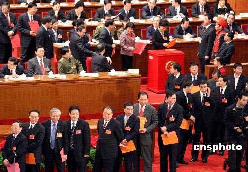 3月16日上午,十一屆全國人大一次會議第六次全體會議在北京人民大會堂舉行,決定國務院總理、中央軍委副主席、委員的人選,選舉最高人民法院院長、最高人民檢察院檢察長。圖為全國人大代表排隊進行表決和選舉投票。中新社發(fā) 張宇 攝
