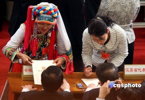 3月17日下午,十一屆全國人大一次會(huì)議在北京人民大會(huì)堂舉行第七次全體會(huì)議,決定國務(wù)院副總理、國務(wù)委員、各部部長、各委員會(huì)主任、中國人民銀行行長、審計(jì)署審計(jì)長及國務(wù)院秘書長人選;表決全國人大各委員會(huì)主任委員、副主任委員、委員名單草案。在投票表決間隙,一些全國人大代表抓緊時(shí)機(jī)在各代表團(tuán)坐席請省領(lǐng)導(dǎo)簽名留念。 中新社發(fā) 張宇 攝