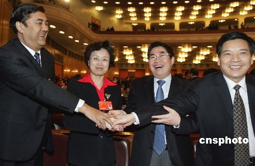 3月8日下午,十一屆全國人大一次會議在北京人民大會堂舉行第二次全體會議。當日是“三八”國際婦女節(jié),大會開始前,在身材魁偉的新疆自治區(qū)主席努爾·白克力(左一)提議下,陜西省省長袁純清(右二)、云南省省長秦光榮(右一),共同祝賀青海省女省長宋秀巖節(jié)日快樂。中新社發(fā) 任晨鳴 攝