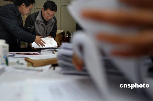 全國政協(xié)十一屆一次會(huì)議委員提案接收工作于三月九日下午兩點(diǎn)截止,圖為大會(huì)提案組辦公室工作人員在清點(diǎn)提案。中新社發(fā) 廖攀 攝
