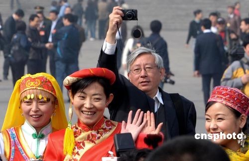 3月10日上午,十一屆全國(guó)人大一次會(huì)議在北京人民大會(huì)堂舉行第三次全體會(huì)議。香港鳳凰衛(wèi)視著名主持人曹景行,在大會(huì)堂外抄后路偷襲抓拍靚麗的少數(shù)民族代表。中新社發(fā) 廖攀 攝