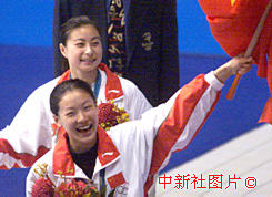伏明霞獲得女子3米板冠軍 2000年9月29日 08:41 ![]() 中國(guó)女子跳水選手伏明霞、郭晶晶二十八日在悉尼奧運(yùn)會(huì)三米跳板比賽中分別獲得金牌和銀牌后,揮舞五星紅旗向觀眾致意。中新社傳真 李剛 攝