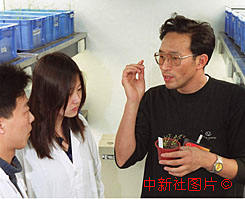 全國人大代表,北京大學副校長陳章良教授(右一)十三日在實驗室與科研人員開展人類第一次破譯全部DNA密碼的高等植物擬南芥的研究。作者:陳勇
