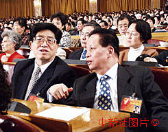 肖揚(yáng)與韓杼濱出席九屆全國(guó)人大三次會(huì)議預(yù)備會(huì) 2000年3月5日 11:51 ![]()