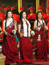 將在中央電視臺春節(jié)聯(lián)歡晚會上演唱的藏族三姐妹,在彩排中演唱她們獨特的姐妹組合和金屬般的聲音。中新社記者 王麗南 攝
