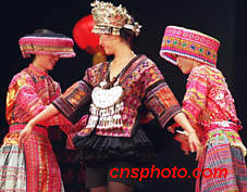 中國(guó)新絲路模特赴德國(guó)表演團(tuán),二十二日在北京嘉里中心飯店舉行專場(chǎng)展示。圖為模特展示中國(guó)歷代少數(shù)民族服飾作品。中新社圖 東方 攝