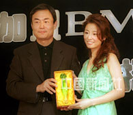 紅遍內(nèi)地、香港及臺(tái)灣的藝人林心如28日在香港、臺(tái)灣媒體的見證下,簽約成為BMG唱片公司旗下歌星,BMG唱片公司崔震東先生并向林心如贈(zèng)送一個(gè)琉璃如意,藉此祝福她的演藝事業(yè)更圓滿如意。中新社傳真 鄧慶樂 攝