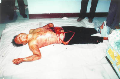 圖:馬健民剖腹尋“法輪” 2001年3月23日 16:55 ![]() 馬健民,男,54歲,華北油田退休職工。其家人稱,馬已練習(xí)“法輪功”兩年左右,達到了癡迷的程度,時常出現(xiàn)精神恍惚和失常,堅持認為自己的腹部有個“法輪”。1998年9月4日馬健民在家中用剪刀剖腹尋找,因救治不及時死亡。這是馬健民自殺后的慘景。新華社發(fā) |