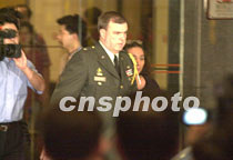 美國(guó)駐華使館國(guó)防武官席樂(lè)高準(zhǔn)將十日晚七時(shí)許走出海口文華大酒店,乘中方車輛前去與美機(jī)組人員見(jiàn)面。中新社記者 賈國(guó)榮 攝