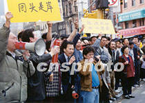 紐約華人社團(tuán)聯(lián)合會(huì)等僑團(tuán)二十一日在華埠鬧市的六個(gè)地段向行人講解“法輪功”的危害。聯(lián)合總會(huì)主席梁冠軍(左四)用麥克風(fēng)向“法輪功”信徒呼吁珍惜自己和家人的生命,不要再受李宏志的蒙騙。中新社圖 郭健 攝