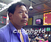 中國(guó)深滬股市周一的大幅下跌使北京證券市場(chǎng)的股民頗為吃驚。當(dāng)日深證成份指數(shù)以跌223.995點(diǎn)(-5.16%)報(bào)收,上證指數(shù)以跌108.91點(diǎn)(-5.27%)報(bào)收。七月以來,中國(guó)股民對(duì)國(guó)有股減持價(jià)格過高表示了一定的擔(dān)憂。中新社記者 鄒憲 攝
