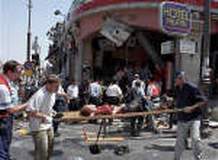 耶路撒冷爆炸:以內(nèi)政部長說十七人死亡(圖) 2001年08月09日 22:28 一名在爆炸事件中受傷的婦女正被抬上救護車。 | |||