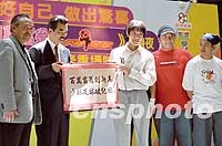 亞視行政總裁封小平(右二)與周星馳等人出席儀式,周星馳將聯(lián)同《少林足球》演員于20日踏上「百萬大道」,爭取百萬善款,該晚贏得之所有獎金,將全數(shù)撥捐瑪麗醫(yī)院癌病兒童。中新社圖 吳智仁 攝