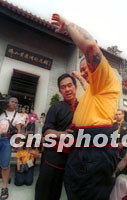 圖文:海外黃飛鴻門人到廣東佛山尋根拜祖 2001年08月28日 06:15 ![]() 南粵武林一代宗師黃飛鴻的一百多名海外弟子,27日在佛山黃飛鴻紀(jì)念館依照傳統(tǒng)武林習(xí)俗祭拜祖師黃飛鴻。他們是專程從美國(guó)、德國(guó)、瑞典等地來粵參加佛山黃飛鴻紀(jì)念館全面開業(yè)暨黃飛鴻一百四十五周年寶誕尋根拜祖等系列活動(dòng)的。中新社記者 梁永強(qiáng) 攝 ![]() 27日,來自美國(guó)的黃飛鴻傳人、著名武術(shù)家余志偉在佛山黃飛鴻紀(jì)念館前為其洋弟子舉行隆重的入室弟子授腰帶儀式,以示對(duì)祖師的崇敬。中新社記者 梁永強(qiáng) 攝
