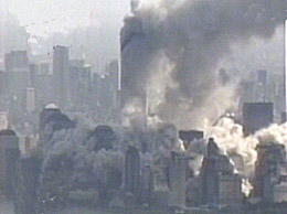世貿(mào)中心二座大廈完全倒塌 大樓內(nèi)有5萬(wàn)多人 2001年09月11日 22:38 ![]() 世貿(mào)大廈遭恐怖襲擊