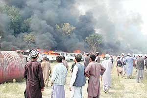 圖文:阿富汗反美大示威中有12名警察受傷 2001年09月27日 11:10 ![]() 示威者圍觀美國大使館內(nèi)狂燒的車子。路透社 圖 中新網(wǎng)香港9月27日消息:幾千名阿富汗示威者昨天闖入美國駐阿富汗大使館,放火焚燒遭丟棄的汽車,火勢波及大使館的外圍建筑,但主樓并未受破壞。 塔利班士兵同大使館內(nèi)外暴亂的示威者發(fā)生沖突,消防員最終把火勢控制住?Σ紶柧焓啄X尤努斯說,12名警察在設(shè)法控制暴亂時受傷。他說:“我們盡力避免這樣的事情發(fā)生,但示威者的人數(shù)使我們不可能成功。他們有幾千人! 38歲的示威者烏拉說,示威的目的是向美國發(fā)出信號!拔覀兏傻煤谩!边@名店主說,“美國要燒掉我們的國家,所以我們焚燒他們的大使館! 美國駐阿富汗大使館自1989年起就無人駐守,只保留了一些阿富汗雇員負責維修等有限的工作。據(jù)悉,這次示威是美國遭襲以來喀布爾發(fā)生的最大規(guī)模反美事件。 |