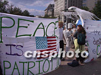 成千上萬來自全美各地的反戰(zhàn)人士,九月二十九日聚集在美國首都華盛頓,舉行反戰(zhàn)游行示威,他們高舉“和平是愛國的”橫幅,以此明志。中新社記者 徐德金 攝