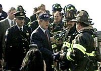 圖:布什訪問(wèn)紐約 慰問(wèn)消防隊(duì)員 2001年10月04日 11:07 ![]() 美國(guó)總統(tǒng)布什三日清晨來(lái)到紐約。他一下飛機(jī),就頭戴印有“紐約市消防局”字樣的棒球帽,和參加救援與清理工作的人們握手!熬乓灰弧笨植酪u擊案三周來(lái),布什現(xiàn)已兩次訪問(wèn)紐約。 |