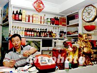 臺(tái)北市南京東路附近一條街巷內(nèi),一對祖籍中國大陸山東省威海市夫婦開辦的小餐館生意不錯(cuò),柜臺(tái)上擺滿了佛像、麥當(dāng)勞叔叔和中國大陸的紹興酒。中新社傳真 任晨鳴 攝