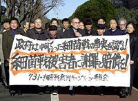 圖:侵華日軍細(xì)菌戰(zhàn)案結(jié)束法庭調(diào)查舉證 2001年12月26日 18:38 ![]() 一百八十名中國受害者起訴侵華日軍七三一部隊(duì)實(shí)施細(xì)菌戰(zhàn)罪行的訴訟歷時(shí)四年之久,26日結(jié)束了法庭調(diào)查舉證階段,明年春將予判決。圖為中國原告代表與日本代理律師在26日開庭前,在東京地方法院前宣示決心。中新社記者 陶光雄 攝 |