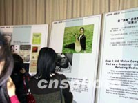 圖:中國留美學生觀看揭露邪教"法輪功"圖片展 2002年01月16日 17:05 ![]() 美國時間十五日晚,一個揭露“法輪功”邪教本質的圖片展在中國駐美使館為留學人員舉行的新年招待會上展出,幾名女留學生站在去年一月二十三日在天安門廣場上自焚的陳果圖像前,扼腕痛惜。中新社記者 徐德金 攝 |