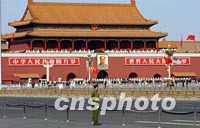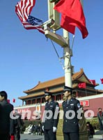 ![]() 美國(guó)總統(tǒng)布什二月二十一日來(lái)華訪問(wèn),兩國(guó)國(guó)旗同時(shí)在天安門(mén)前飄揚(yáng)。中新社圖 杜洋 攝