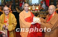 圖:兩岸佛教人士互贈送禮品 2002年02月22日 13:56 ![]() 在西安參加法門寺佛指舍利赴臺灣地區(qū)瞻禮(供奉)活動的兩岸佛教人士,二十二日上午來到西安大慈恩寺參觀,該寺方丈增勒法師向臺灣佛教人士贈送禮品。中新社記者 錢興強 攝