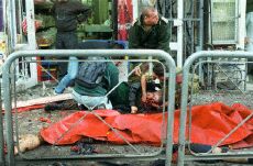 耶路撒冷發(fā)生自殺炸彈襲擊 至少兩人死亡(圖) 2002年03月21日 23:29 ![]() 一名傷者在死者遺體邊接受急救 中新網(wǎng)北京3月21日消息:耶路撒冷市中心今天發(fā)生自殺性炸彈襲擊,造成至少兩人死亡,另有四十人受傷。此事對美國推動中東和平進程的努力無疑又構(gòu)成沉重打擊。 當(dāng)?shù)鼐秸f,事件發(fā)生在當(dāng)?shù)貢r間21日下午4時25分左右。出事地點靠近最近發(fā)生的多起槍擊與炸彈襲擊地區(qū)。 目擊者說,多輛救傷車在事發(fā)后趕到現(xiàn)場并載走許多傷者,警方已封鎖現(xiàn)場,方便進行救人的工作。 據(jù)以色列電臺報道,初步報告指出,有7名傷者的傷勢相當(dāng)嚴重。