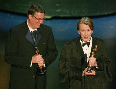 中新網(wǎng)北京3月25日消息:《指環(huán)王》獲得最佳化妝獎,理查德·泰勒和匹特·歐文接過奧斯卡金人,此外,該片還獲得了最佳攝影大獎。(法新圖)