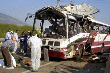 圖文:以色列海法公車遭自殺炸彈襲擊10人死亡 2002年04月10日 14:04 ![]() 圖為被炸彈襲擊的公車。法新社圖 中新網(wǎng)北京4月10日消息:法新社援引以色列醫(yī)院方面的消息說,今天在以色列北部城市海法的公車自殺炸彈襲擊事件中,至少有10人死亡,另有20人受傷。 當(dāng)?shù)剀姺诫娕_的報(bào)道也援引紅十字會性質(zhì)組織的消息說,至少有10人死亡。據(jù)目擊者說,這次爆炸將遇襲公車的車頂炸穿。 而路透社的報(bào)道則說,上述緊急救援組織的的官員說,有8人在爆炸中死亡。以色列的媒體早先報(bào)道的死亡數(shù)字為10人。 報(bào)道還援引警方和救援工作者的消息說,一名自殺炸彈襲擊者今天上午交通高峰期在一輛擁擠的公車上引爆炸彈,造成至少8人死亡,12人受傷。 哈馬斯組織軍事派別宣稱對海法自殺炸彈襲擊負(fù)責(zé) 中新網(wǎng)北京4月10日消息:卡塔爾半島電視臺報(bào)道說,哈馬斯組織的軍事派別今天宣布對發(fā)生在以色列北部城市海法的自殺炸彈襲擊事件負(fù)責(zé)。 哈馬斯組織的“埃澤丁——卡薩姆旅”打電話給半島電視臺駐西岸城市拉姆安拉的辦公室,宣稱對此事負(fù)責(zé)。 一名自殺炸彈襲擊者今天上午交通高峰期在海法市一輛擁擠的公車上引爆炸彈,造成至少10人死亡,約20人受傷。 以色列總理沙龍的一名助手聲稱,巴勒斯坦領(lǐng)導(dǎo)人阿拉法特應(yīng)對這起恐怖襲擊事件負(fù)責(zé)。 巴勒斯坦:海法襲擊是對沙龍?bào)a臟戰(zhàn)爭的“自然反應(yīng)” 中新網(wǎng)北京4月10日消息:巴勒斯坦政府表示,今天發(fā)生在以色列城市海法的公車爆炸事件是對以色列總理沙龍“骯臟戰(zhàn)爭的自然反應(yīng)”。 據(jù)法新社報(bào)道,巴勒斯坦內(nèi)閣秘書阿卜杜拉赫曼說:“沙龍對此負(fù)有責(zé)任。他是對巴勒斯坦人民和民族權(quán)力機(jī)構(gòu)發(fā)起骯臟侵略的人! 阿卜杜拉赫曼還說:“這是對這場骯臟戰(zhàn)爭和發(fā)生在難民營的事件的自然反應(yīng)! 哈馬斯組織的軍事派別今天打電話給半島電視臺駐西岸城市拉姆安拉的辦公室,宣稱對此海法的自殺炸彈襲擊事件負(fù)責(zé)。 以色列官員稱阿拉法特應(yīng)對自殺炸彈襲擊負(fù)責(zé) 中新網(wǎng)北京4月10日消息:以色列官員今天說,巴勒斯坦領(lǐng)導(dǎo)人阿拉法特應(yīng)為海法市的自殺炸彈襲擊事件負(fù)責(zé)。 據(jù)法新社報(bào)道,以色列總理沙龍的助手說:“亞瑟·阿拉法特對這起恐怖襲擊事件負(fù)責(zé),這再次證明他對恐怖主義無所作為,相反他在鼓勵這種行為! 這名以色列官員還說,這次襲擊事件“只能證明繼續(xù)3月29日開始的對恐怖主義基礎(chǔ)組織的軍事行動是合理的”。 自從3月29日海法市發(fā)生自殺炸彈襲擊事件以來,以色列就對西岸地區(qū)發(fā)動大規(guī)模軍事行動,并將巴勒斯坦領(lǐng)導(dǎo)人阿拉法特圍困在拉姆安拉的總部。
