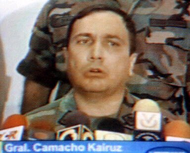 ![]() 委內(nèi)瑞拉當?shù)貢r間4月11日晚(北京時間12日上午),國民警衛(wèi)隊的卡伊魯茲將軍在當?shù)仉娨暸_宣布,總統(tǒng)查韋斯的政府已經(jīng)“不再履行其職能”,全國局勢已經(jīng)被軍隊控制。圖為卡伊魯茲將軍在電視臺講話時的電視截頻圖像。(春風)