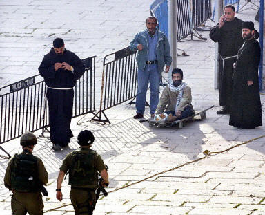 詳訊:39名巴勒斯坦武裝人員今天離開圣誕教堂 2002年05月10日 14:10 圖為受腿傷的武裝人員。法新圖 中新網(wǎng)北京5月10日消息:伯利恒當(dāng)?shù)貢r間5月10日上午(北京時間5月10日中午),被困伯利恒圣誕教堂長達(dá)五周之久的39名巴勒斯坦武裝人員今天被幾輛公共汽車帶走。根據(jù)歐盟調(diào)解的協(xié)議,其中13名以色列方面強烈通緝的武裝人員將被一架英國軍用飛機帶往塞浦路斯,然后轉(zhuǎn)往幾個歐洲國家。另外26名武裝人員將被帶往加沙地區(qū)。 據(jù)以色列軍方的一位發(fā)言人稱,載有13名巴方武裝人員的公共汽車已經(jīng)抵達(dá)教堂附近的一個軍事基地,其中一名武裝人員將在那里接受腿傷治療,然后他們將被帶往特拉維夫附近的一個機場。 另據(jù)報道,英國一架軍用飛機已經(jīng)離開塞浦路斯基地,前往以色列引渡13名巴勒斯坦武裝人員,這些武裝人員曾在伯利恒的圣殿教堂與以色列軍方對峙交火。 這架軍用飛機的型號是綽號“大力神”的C-130型運輸機,塞浦路斯官員表示,“有關(guān)方面通知我們這架飛機是前往以色列引渡巴勒斯坦人員的! 塞浦路斯曾于本周四與歐盟官員進行過協(xié)商,并決定暫時收容這13名巴方武裝人員。官員們預(yù)計這些武裝人員將在塞浦路斯停留至下周一,然后由歐盟外長會議決定他們應(yīng)當(dāng)被引渡到何地。被引渡的13名武裝人員中包括伯利恒的巴勒斯坦情報部門的首腦阿卜杜拉-道德(Abdullah Daoud)。 根據(jù)以巴雙方達(dá)成的和解協(xié)議,在這13名巴方的武裝人員被引渡到歐盟國家以后,另外26名巴方人員將被帶到加沙地區(qū),以方還將釋放大約85名平民。(春風(fēng))