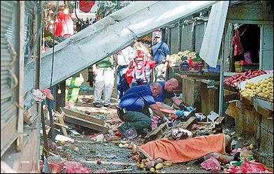以色列內(nèi)坦亞爆炸3人死亡 以軍開進拉馬拉 2002年05月20日 08:08 ![]() 以色列北部海濱城市內(nèi)坦亞市中心的一個集貿(mào)市場發(fā)生自殺式炸彈爆炸。(法新圖) 中新網(wǎng)北京5月20日消息:耶路撒冷訊,以色列北部海濱城市內(nèi)坦亞19日下午發(fā)生的自殺式炸彈爆炸中,死亡人數(shù)目前已經(jīng)上升至3人,另外還有至少50人受傷,其中8人傷勢嚴(yán)重。 以色列電視臺報道說,爆炸發(fā)生在當(dāng)?shù)貢r間16時25分前后(北京時間21時25分),爆炸地點為內(nèi)坦亞市中心的集貿(mào)市場。巴勒斯坦激進組織哈馬斯已經(jīng)宣布對此次襲擊負(fù)責(zé)。 美聯(lián)社報道說,這名發(fā)動自殺式炸彈襲擊的巴勒斯坦人身穿著以色列陸軍軍服,于周日混入內(nèi)坦亞市中心的一個集貿(mào)市場。 幾個小時后,巴勒斯坦目擊者稱,一些以軍坦克開進了西岸城市拉馬拉。而以軍發(fā)言人則稱,開進拉馬拉的只是幾輛裝甲運兵車而非坦克。這些部隊短時間內(nèi)即撤出了該城市,沒有傷及巴勒斯坦人。