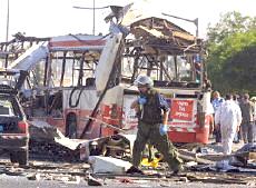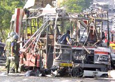 耶路撒冷市中心公共汽車爆炸案已有18人死亡(圖) 2002年06月18日 15:29 ![]() ![]() 被襲擊的公共汽車 中新網(wǎng)北京6月18日消息:以色列電視二臺18日報道說,耶路撒冷市中心當(dāng)日上午發(fā)生公共汽車自殺炸彈襲擊事件,造成17人死亡。 報道沒有說明死亡人數(shù)中是否包括自殺炸彈襲擊者本人。這起自殺性炸彈襲擊還造成車上32人受傷。 這輛公共汽車從耶路撒冷南郊的吉羅猶太人區(qū)開往市中心,當(dāng)時正是交通高峰時段。 阿克薩烈士旅宣稱對耶路撒冷公汽爆炸案負(fù)責(zé) 中新網(wǎng)北京6月18日消息:黎巴嫩真主黨游擊隊的電視臺18日接到匿名電話,此人聲稱“阿克薩烈士旅”對耶路撒冷爆炸案負(fù)責(zé)。 德新社援引該電視臺的報道說,這次炸彈襲擊是為了“阿克薩烈士旅”在伯利恒的領(lǐng)導(dǎo)人蘇布赫17日被殺而進(jìn)行的報復(fù)。 耶路撒冷南部18日交通高峰時段發(fā)生公共汽車爆炸案,造成13人死亡,40人受傷,其中5人情況危急。 哈馬斯組織也聲稱對耶路撒冷公汽爆炸案負(fù)責(zé) 中新網(wǎng)北京6月18日消息:巴勒斯坦激進(jìn)的“伊斯蘭抵抗運動”(哈馬斯組織)18日宣稱對耶路撒冷公共汽車爆炸案負(fù)責(zé)。 有人給法新社打去匿名電話,聲稱哈馬斯組織的軍事派別“卡薩姆旅”實施了這次行動。 另據(jù)報道,黎巴嫩真主黨游擊隊的電視臺也接到匿名電話,此人聲稱“阿克薩烈士旅”對耶路撒冷爆炸案負(fù)責(zé)。 耶路撒冷市中心18日交通高峰時段發(fā)生公共汽車爆炸案,造成17人死亡,約30人受傷。 沙龍親臨耶路撒冷爆炸現(xiàn)場拒談巴勒斯坦建國 中新網(wǎng)北京6月18日消息:在耶路撒冷市中心發(fā)生造成17人死亡的公汽爆炸案后,以色列總理沙龍18日拒絕巴勒斯坦建國。 據(jù)法新社報道,沙龍在事發(fā)現(xiàn)場對記者表示:“你還能談什么巴勒斯坦國家!边@是沙龍出任總理以來首次親往巴勒斯坦人自殺炸彈襲擊現(xiàn)場視察。 沙龍在數(shù)十名警察和保鏢的簇?fù)硐卤硎荆骸拔覀兘裉煲姷降氖前屠账固箍植乐髁x,我們必須打擊這種恐怖主義,這也正是我們在做的。” 美國官員最近提出建立臨時的巴勒斯坦國家的構(gòu)想,并通過談判確定其最終的形式。 18日的自殺性炸彈襲擊發(fā)生之際,美國總統(tǒng)布什正準(zhǔn)備宣布其中東和平新戰(zhàn)略。 耶路撒冷公汽爆炸案造成18名以色列人死亡 中新網(wǎng)北京6月18日消息:18日在耶路撒冷市中心,一名巴勒斯坦人在公共汽車上引爆炸彈,造成18名以色列人死亡,其中包括一些學(xué)童。 據(jù)法新社報道,醫(yī)院官員透露說,48名傷者正在接受治療,其中包括數(shù)名年齡在10到12歲之間的兒童。 報道還說,一名婦女在入院后不久就不治身亡,另外還有6名傷者的傷勢嚴(yán)重。 相關(guān)報道:耶路撒冷南部發(fā)生公車爆炸 13人死亡40人受傷