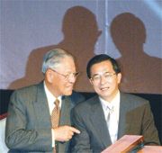 陳水扁與李登輝同臺現(xiàn)身 一唱一和鼓吹“臺獨” 2002年08月12日 09:49 ![]() 李登輝(左)與陳水扁交頭接耳(臺灣聯(lián)合報圖) 中新網(wǎng)香港8月12日消息:臺北訊,陳水扁與李登輝昨天先后在“臺獨”黨派“臺灣團結(jié)聯(lián)盟”一周年“黨慶”活動中放話,再放“臺獨”厥詞,而且兩人致詞內(nèi)容明顯相互呼應(yīng)。 在“臺聯(lián)黨”的“特別安排”下,陳水扁與李登輝兩人繼陳氏拋出“一邊一國論”之后,首度公開同臺亮相。 陳水扁在發(fā)言時未提所謂“一邊一國”論,但又抹黑中國大陸對臺灣“武力威脅”和“國際打壓”,并鼓動說:“對的信念絕不放棄,對的路要繼續(xù)走。” 陳水扁還用閩南語說,“不能被人唬得驚驚到”,要“歡喜看未來”。 李登輝隨后發(fā)言公開支持陳水扁,聲稱“百分之百”支持所謂“一邊一國”論,并指此論為“事實的表述”。這名“臺聯(lián)黨”的“精神導(dǎo)師”更鼓吹堅持臺灣“主權(quán)獨立”,并指兩岸是“國與國的關(guān)系”。 李登輝呼應(yīng)陳水扁“不要被嚇倒”的說法,對“臺獨”份子放話說“免驚啦”,而且“不要被臺北‘外來政權(quán)’的大本營與統(tǒng)派媒體嚇倒”。 島內(nèi)媒體報道指出,陳水扁與李登輝先后發(fā)言的內(nèi)容明顯相互呼應(yīng),陳水扁要“臺聯(lián)黨”在當(dāng)局“立法院”中力拼李登輝定的“指標(biāo)”說35席,李登輝則說“很不好意思,還差20多席”;陳水扁要大家不要被中國大陸“嚇倒”,李登輝則要大家“安心”。兩人不僅相偕進場,而且陳水扁在臺上講話時,臺下的李登輝頻頻拍手。