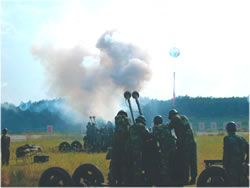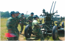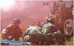 演習(xí)剛剛開(kāi)始,一隊(duì)民兵在我高炮陣地附近忙碌著,他們很快設(shè)立了一個(gè)高炮陣地,原來(lái)他們是用報(bào)廢的高炮設(shè)置了一個(gè)假高炮陣地以迷惑來(lái)襲之“敵”。與此同時(shí),另一隊(duì)民兵在旁邊給一枚導(dǎo)彈模型充氣,不到一分鐘,這枚同樣是用于迷惑“敵人”的地空導(dǎo)彈便豎立起來(lái)。